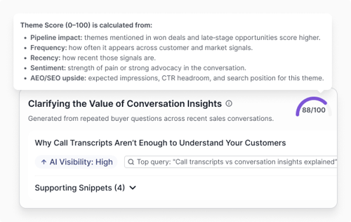 AI scans large volumes of customer conversations, campaigns, and assets to map what we cover versus what prospects ask, similar to how AI solutions for content marketing connect signals to content themes. |
