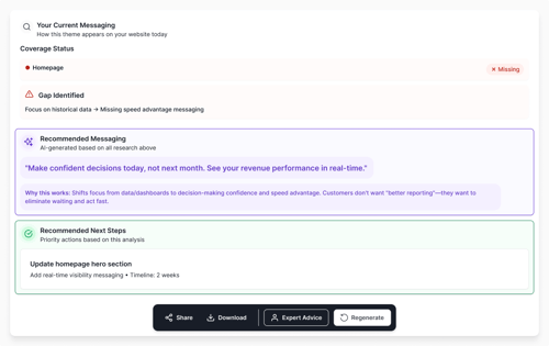 We recommend tying intelligent research directly into your content inventory so that each article, guide, or webinar connects to the latest problem language and priorities. Then, when AI runs a gap analysis pass, it can highlight not just missing topics but misaligned messaging that no longer reflects how buyers talk in 2026.