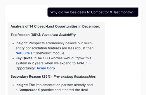 Once signals are unified, the platform should recommend lifecycle plays like “adjust onboarding emails for this segment” or “create a competitive objection asset for late-stage deals.” We use AI to read these signals, but always tie every recommendation back to specific evidence.